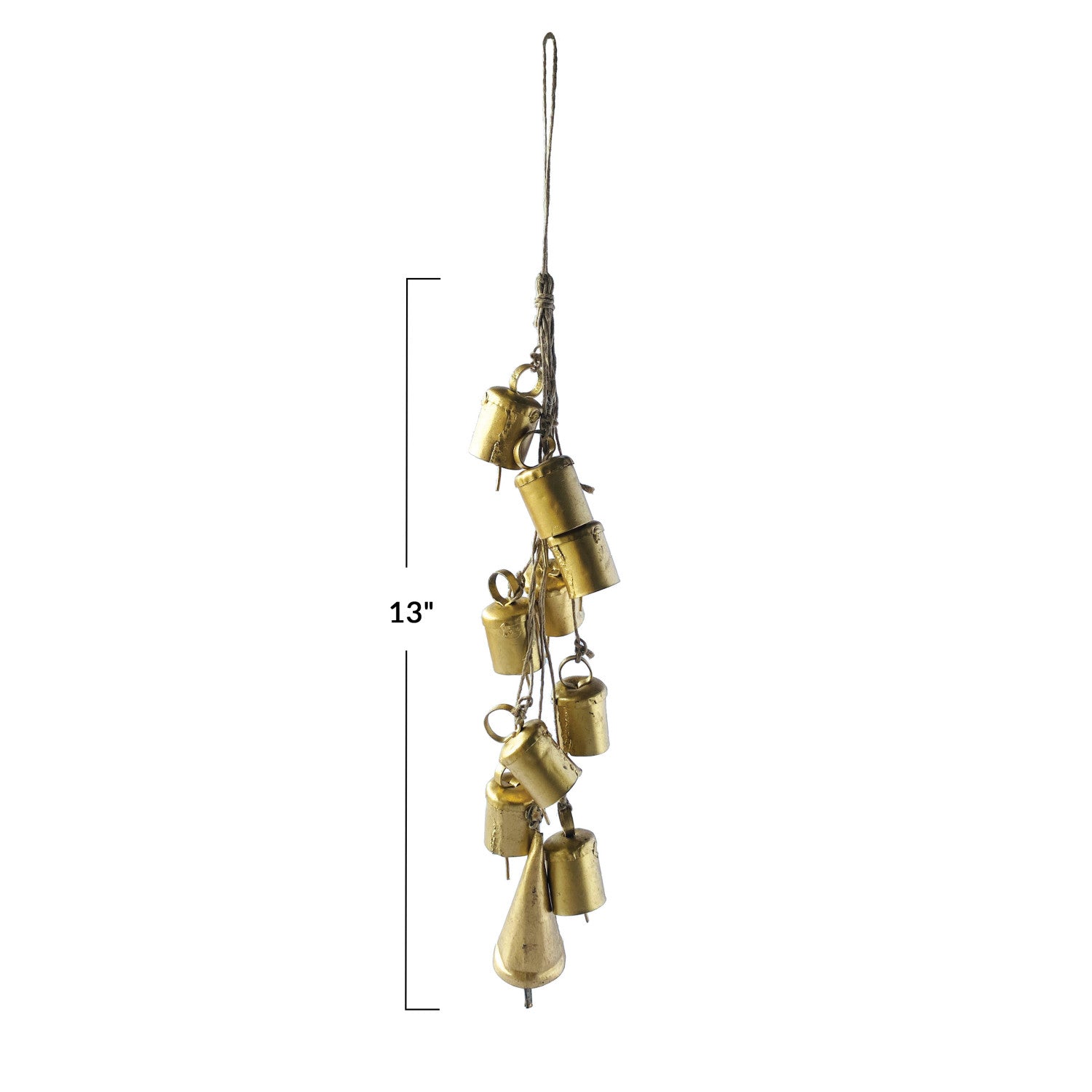 Add a touch of whimsy to your space with this delightful set of handmade hanging metal bells. Featuring nine charming cylinder bells and one unique conical bell, each piece shines in a gleaming gold finish. Together, they create a playful melody and a captivating visual that will brighten any room or outdoor area. Perfect for adding joyful sounds and sparkling style wherever you hang them!