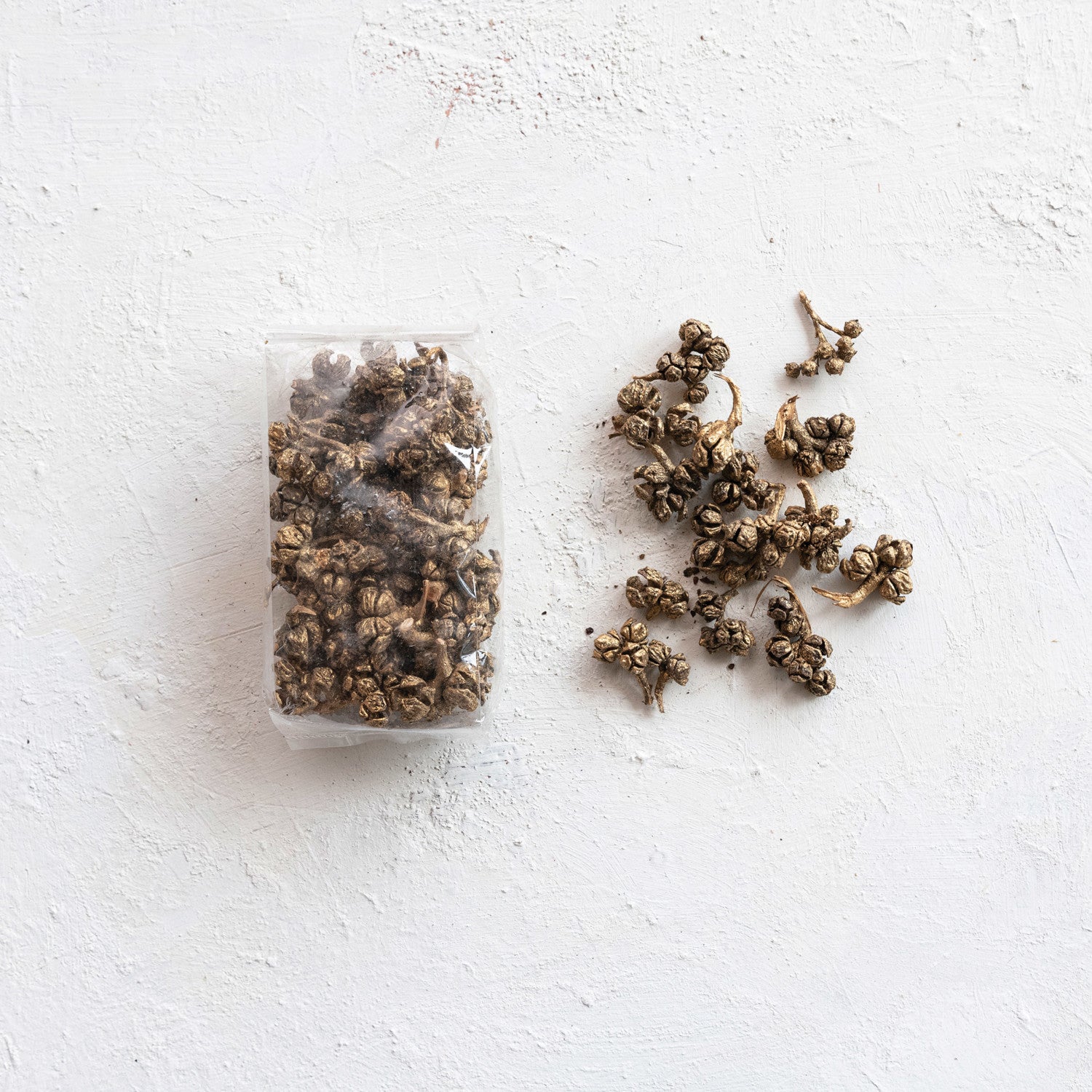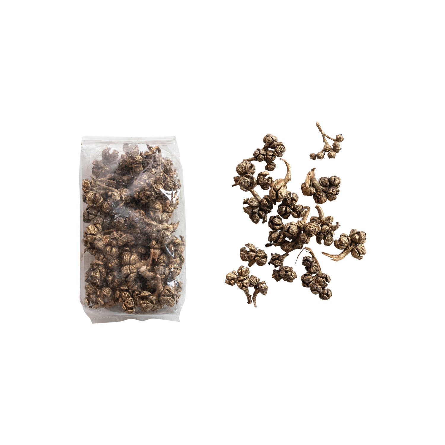 Add a touch of whimsy to your home decor with our dried natural cyprus pods. These charming pods feature a stunning gold finish and are perfect for filling any bowl or candle holder.