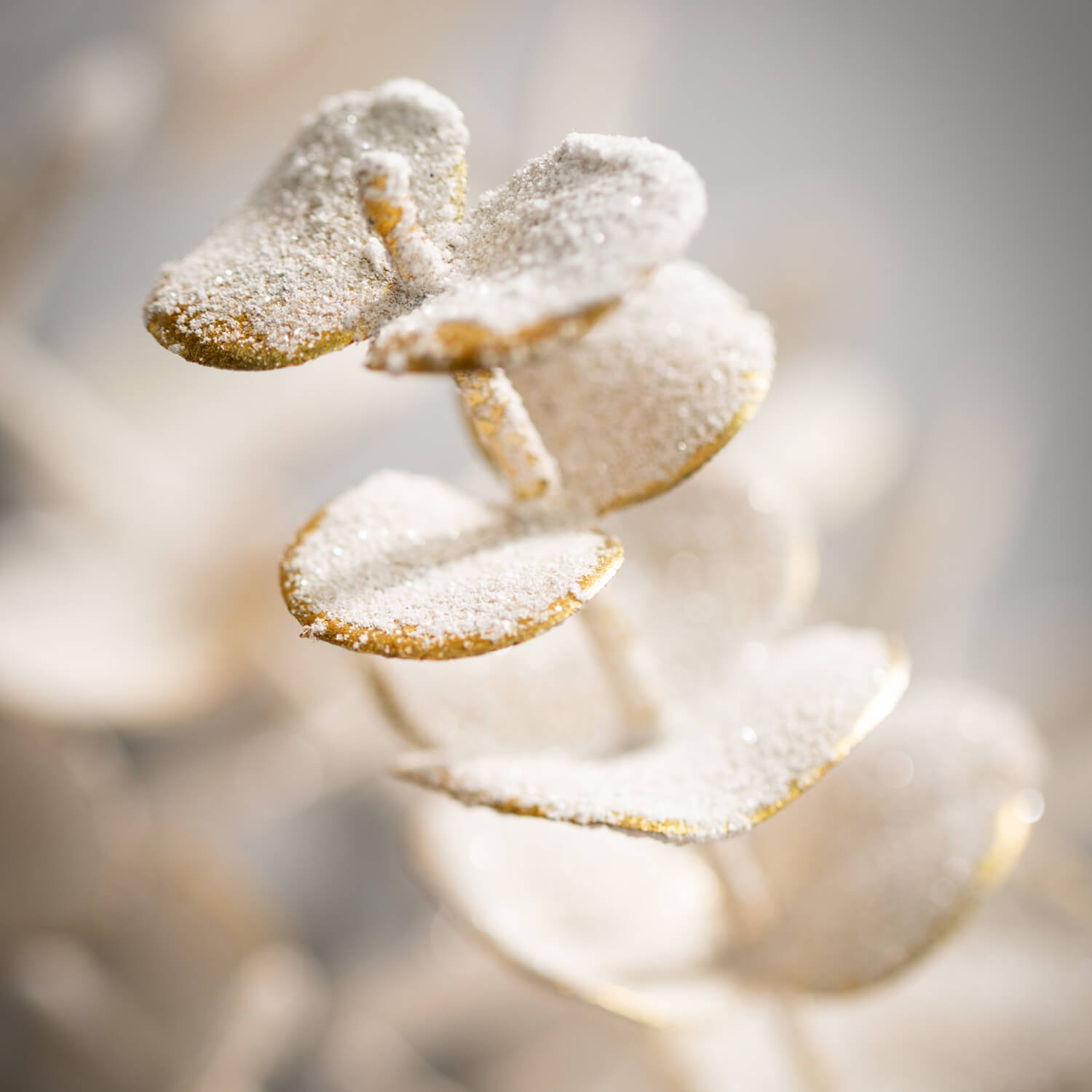 Snow-covered with a sliver of gold coloring peeking through around the edges, this delightful eucalyptus spray is crafted from durable plastic to keep it looking great year after year. This 32" tall branch features foliage covering five individual sprigs.